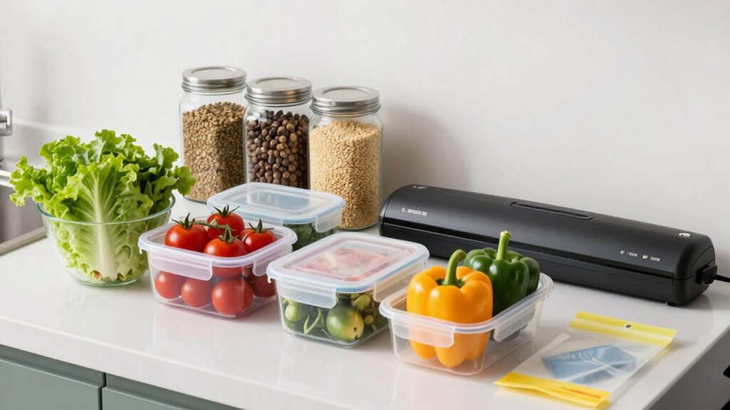 You can extend your food’s shelf life considerably by using airtight containers or vacuum sealing. Airtight containers prevent air from entering, slowing spoilage and freezer burn. Vacuum sealing removes air entirely, which helps preserve freshness and prevent bacteria growth. Both methods reduce moisture and oxidation, keeping your food fresher longer. So, invest in good packaging options like airtight containers or a vacuum sealer to maximize storage time and reduce waste.