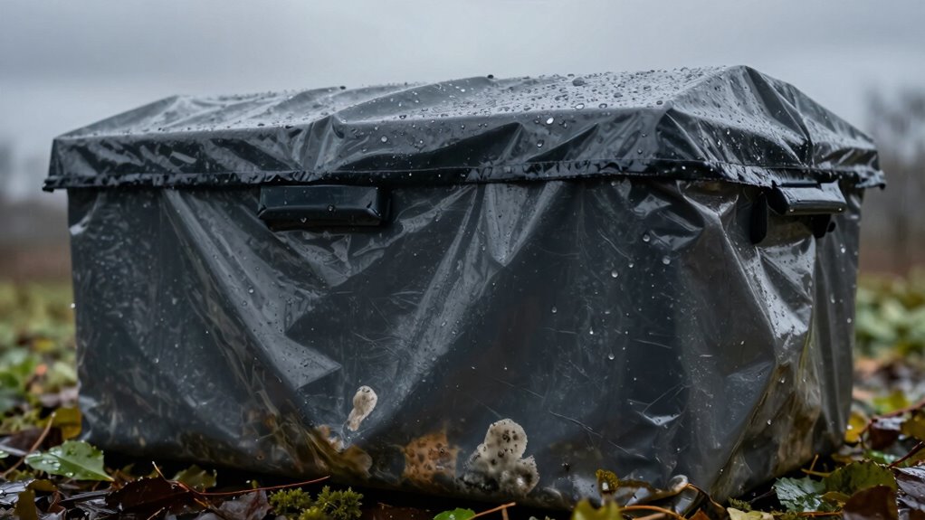 Think of weatherproof covers as a shield in a storm—they protect, but only if you use them wisely. When the sky’s clear, they can trap moisture like a closed umbrella on a sunny day, causing more harm than good. But in rain’s embrace, they’re your armor, guarding your belongings. Use them thoughtfully, and they’ll be your trusty guardian through the weather’s dance—standing strong when needed, and opening up when the sun shines again.