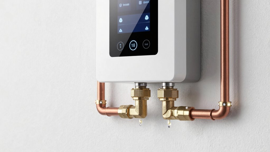 Whole-home water shutoff systems detect leaks using advanced sensors that monitor water flow and moisture levels throughout your plumbing. These sensors are strategically placed in high-risk areas like under sinks, near appliances, or along vulnerable pipes. When a leak is detected, the system automatically triggers an emergency shutoff to stop the water flow instantly. To find out how these systems work seamlessly behind the scenes, keep exploring the details.