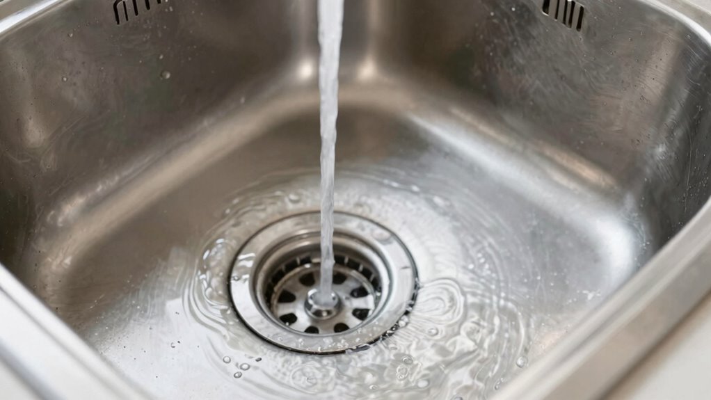 Think of your sink drain like a garden that needs regular tending. You should clean your sink drains at least once a month to keep them flowing smoothly. Regular plumbing maintenance prevents buildup and drain odor, ensuring your sink stays fresh and clog-free. Using natural cleaners like baking soda and vinegar helps maintain your drain’s health, so you won’t have to deal with unpleasant smells or slow drainage.