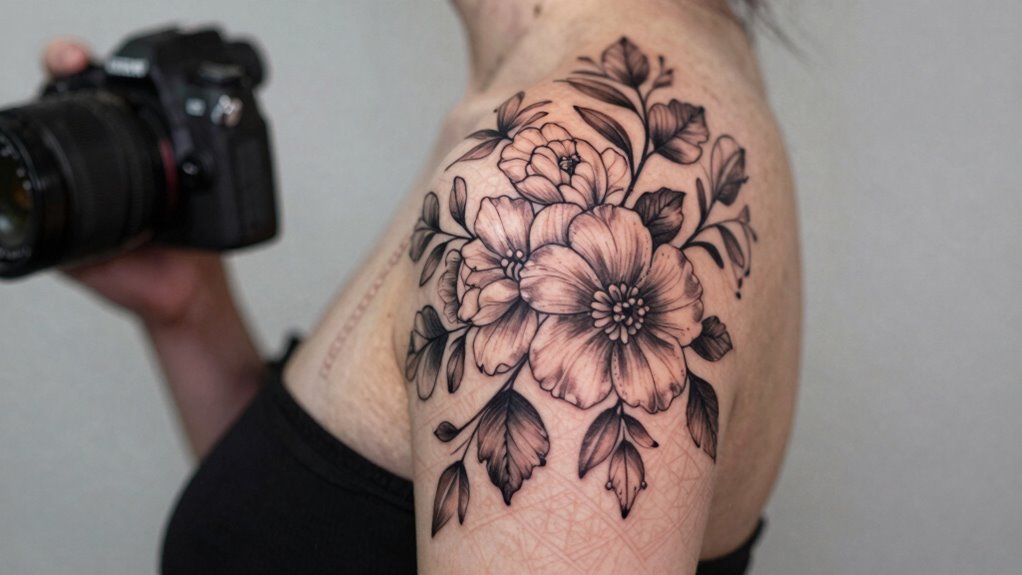 Ever wondered how to guarantee your tattoo artist captures your vision perfectly? Using visual references is key. Bring clear images, sketches, or designs that reflect your idea—these help communicate details like color psychology and overall style. Incorporating visual communication techniques can further enhance understanding and reduce misunderstandings.nnVisuals ensure your artist understands the colors you prefer and how they’ll impact tattoo longevity over time. For example, vibrant hues may fade faster, so referencing images with aged versions can guide better choices.nnBe specific about elements you want, whether it’s shading, placement, or details. The more precise your references, the less room for misinterpretation.nnAdditionally, understanding artistic communication concepts can help you convey your ideas more effectively, reducing the need for revisions and ensuring your vision is accurately realized. Developing your visual literacy can also help you identify and select the most suitable references for your design. Clear visual cues can also help you discuss potential modifications or adjustments during the tattooing process, making sure both you and your artist are on the same page. This clarity helps streamline the process, saving time and reducing surprises. Ultimately, visual references give your artist a concrete foundation to create a shoulder tattoo you’ll love and be proud of for years.