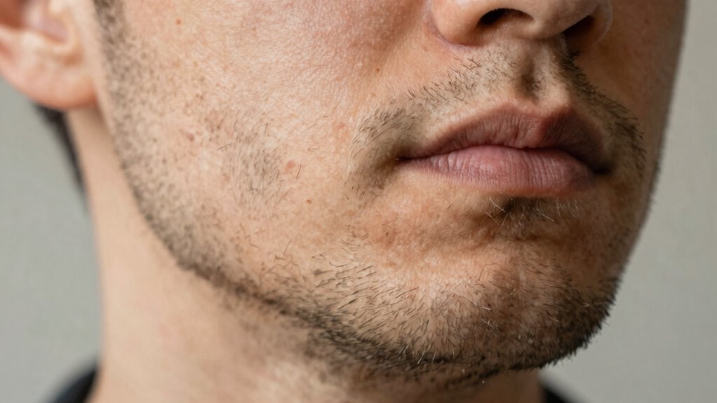 If you’re concerned about patchy or slow-growing facial hair, adopting natural habits can help support healthier growth. Focus on nutrition tips by including foods rich in vitamins A, C, E, and biotin, which promote hair health. Staying hydrated also keeps your skin and hair follicles nourished. Incorporating nutritional support through diet can significantly influence hair growth patterns. Establishing a consistent skincare routine is essential—cleanse your face daily to remove dirt and excess oil, and consider applying natural oils like castor or jojoba oil to stimulate hair follicles. Regular exfoliation can prevent clogged pores and encourage new hair growth. Avoid harsh chemicals and over-washing, which can irritate your skin. Combining proper nutrition with good skincare routines creates an environment conducive to healthy facial hair development. Monitoring hormonal levels can also play a significant role in facial hair growth, so consulting with a healthcare professional may provide additional insights. Additionally, understanding how genetics influence hair growth patterns can help set realistic expectations and guide your efforts. Patience is key, as natural growth takes time and consistent effort.