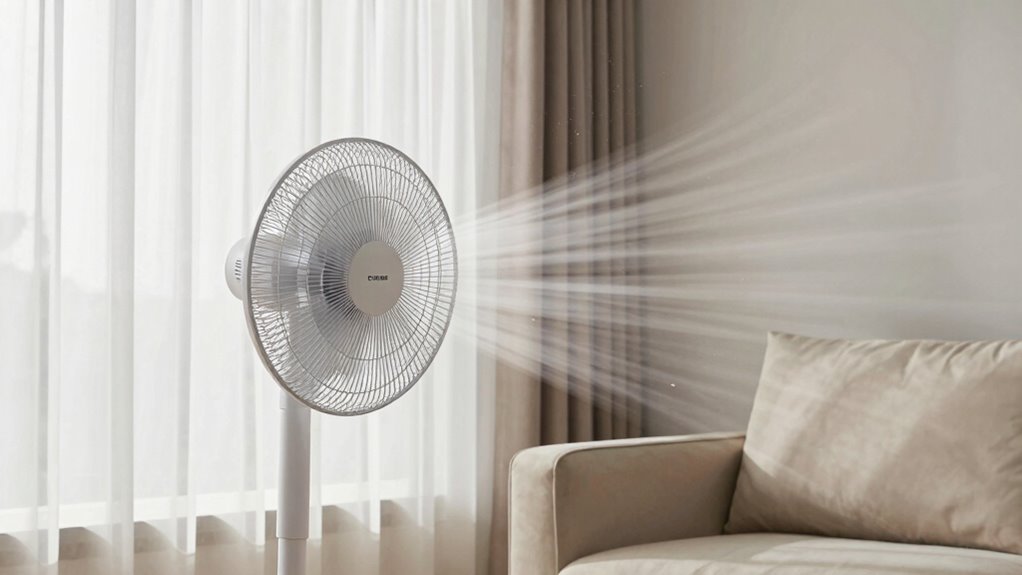 To get a grasp on airflow patterns, consider how air naturally moves from high to low-pressure areas. A fan’s job is to manipulate these patterns to your advantage. For example, positioning a fan near a window or door can help draw in fresh air and push stale air out, establishing a continuous flow that refreshes the room. If you place a fan too close to walls or furniture, it may cause turbulence or dead zones where air doesn’t circulate well. That’s why understanding the room’s layout and how airflow travels within it is vital before setting up your fan.