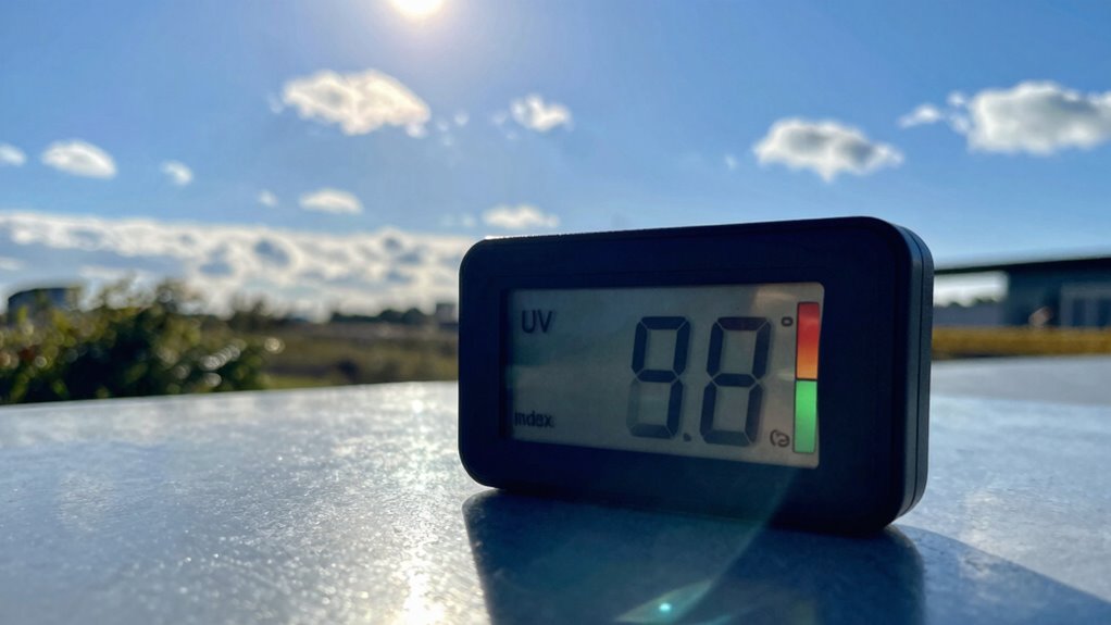 You might notice UV index levels suddenly increase, and several factors cause this. Changes in atmospheric conditions, like clouds clearing or pollution clearing, can raise UV levels unexpectedly. Additionally, fluctuations in the ozone layer and the sun’s position higher in the sky can make UV levels jump without warning. Understanding the UV index helps you better grasp these environmental influences. Moreover, the accuracy of UV measurements can vary depending on the equipment and methods used, which may also contribute to sudden spikes. Variations in wave and wind conditions can also impact the dispersion of UV rays, affecting the readings you see. External factors such as instrument calibration can further influence measurement reliability, leading to unexpected UV index changes. Additionally, atmospheric scattering plays a role in how UV rays reach the Earth’s surface, contributing to fluctuations in the readings.