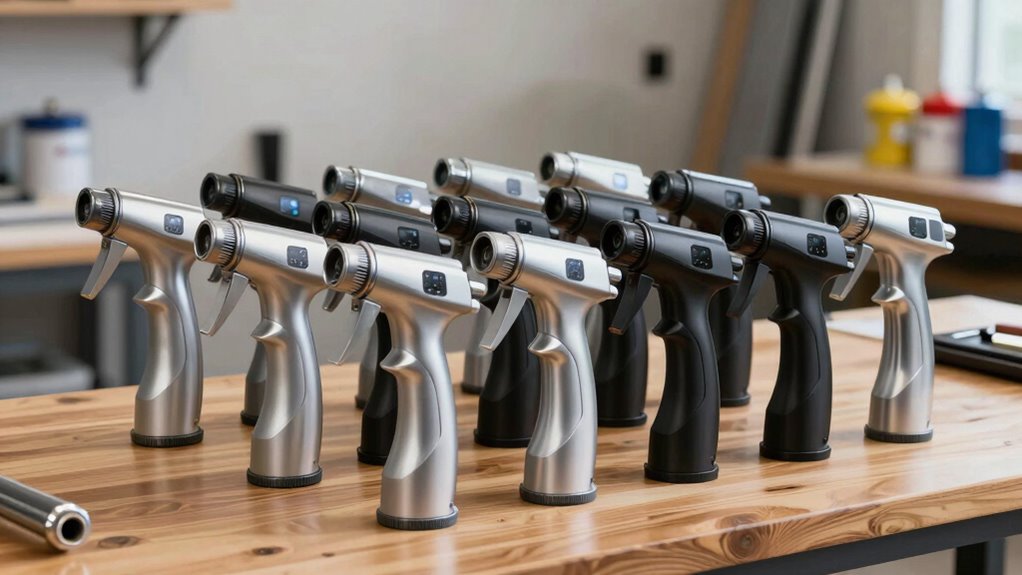 Choosing the right spray pattern is essential for achieving a professional finish and minimizing paint waste. Different options like narrow, wide, and fine patterns let me customize application based on the surface and project size. Adjustable spray patterns help me reduce overspray and control coverage more precisely. Multi-pattern spray guns give me the flexibility to switch between detailed work and broad coverage, improving the overall quality of my finish. Being able to quickly change spray patterns boosts efficiency when moving between different surfaces or stages. Some airless sprayers even feature adjustable nozzles, allowing me to select or modify spray patterns to match various coatings and application needs. This versatility guarantees I get a smooth, consistent result every time while saving time and material.