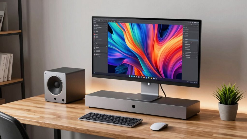 Choosing the right amount of memory and storage is essential for ensuring your compact workstation Mac can handle your workload efficiently. Larger memory capacities, like 24GB or more, greatly improve multitasking and make handling large files smoother, especially in professional workflows. Storage options ranging from 512GB to 2TB or higher provide enough space for software, projects, and media assets without constant management. The unified memory architecture allows for faster data access, resulting in better overall performance across applications. Upgrading to higher memory and storage not only boosts current efficiency but also future-proofs your setup for more demanding tasks down the line. To optimize your experience, consider your specific workload needs and find a balance that offers enough memory and storage without unnecessary excess.