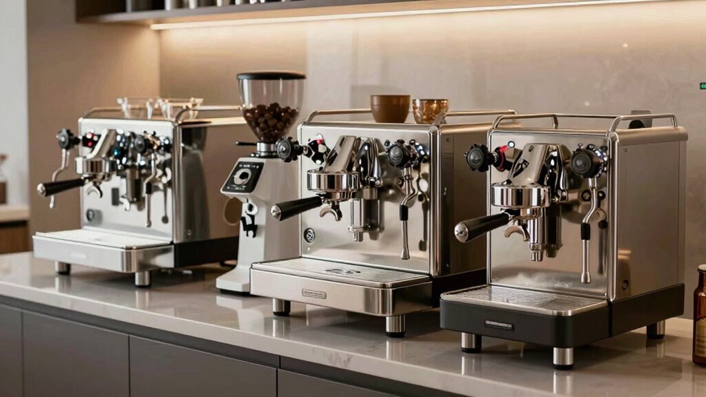Ever wondered if replacement parts are easy to find? I can tell you they’re generally widely available for these models, especially from reputable brands. Parts like grinders, filters, and seals are usually stocked by manufacturers or through authorized dealers. This accessibility helps guarantee your espresso machine stays in top shape for years. So, yes, maintaining your machine won’t be a hassle, and repairs are often straightforward if needed.
