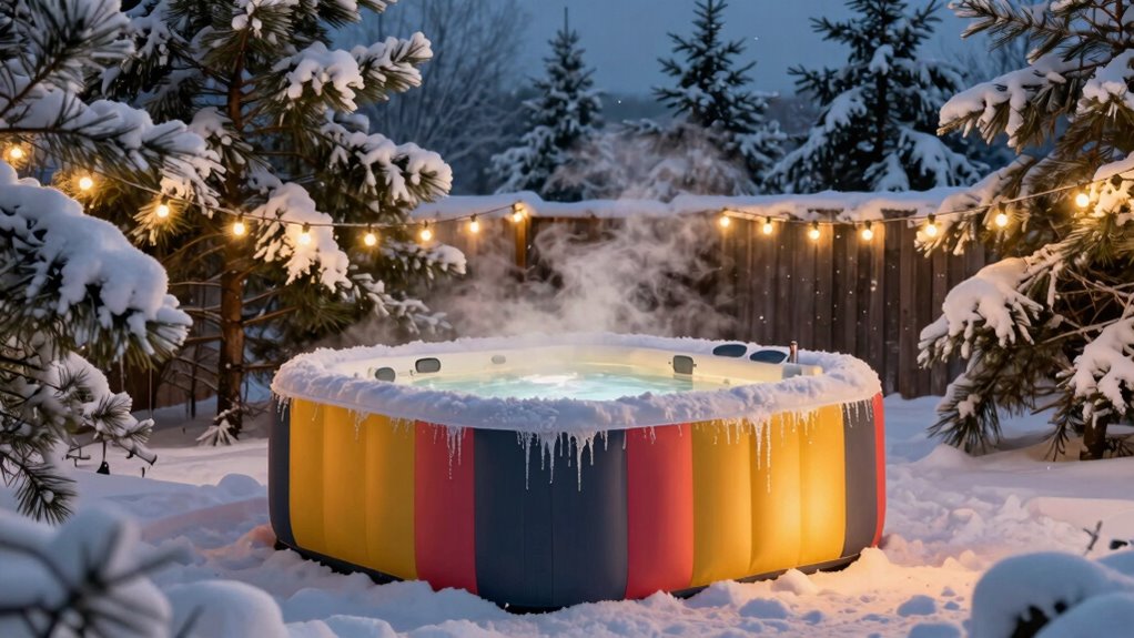 When selecting an inflatable hot tub for cold weather, pay close attention to its freeze protection features. Effective systems automatically activate when outdoor temperatures drop below a certain point, preventing water from freezing inside the tub. Many models include built-in freeze shields that continuously monitor water temperature and trigger heating elements to maintain safe levels. External insulation, like thermal covers and insulating sponge mats, also plays a crucial role by retaining heat and reducing the risk of freezing. Some tubs offer programmable freeze protection settings, allowing customization based on your climate. Proper freeze protection is essential to prevent damage to critical components such as the pump, heater, and plumbing, ensuring your hot tub stays functional and durable even in the coldest weather.