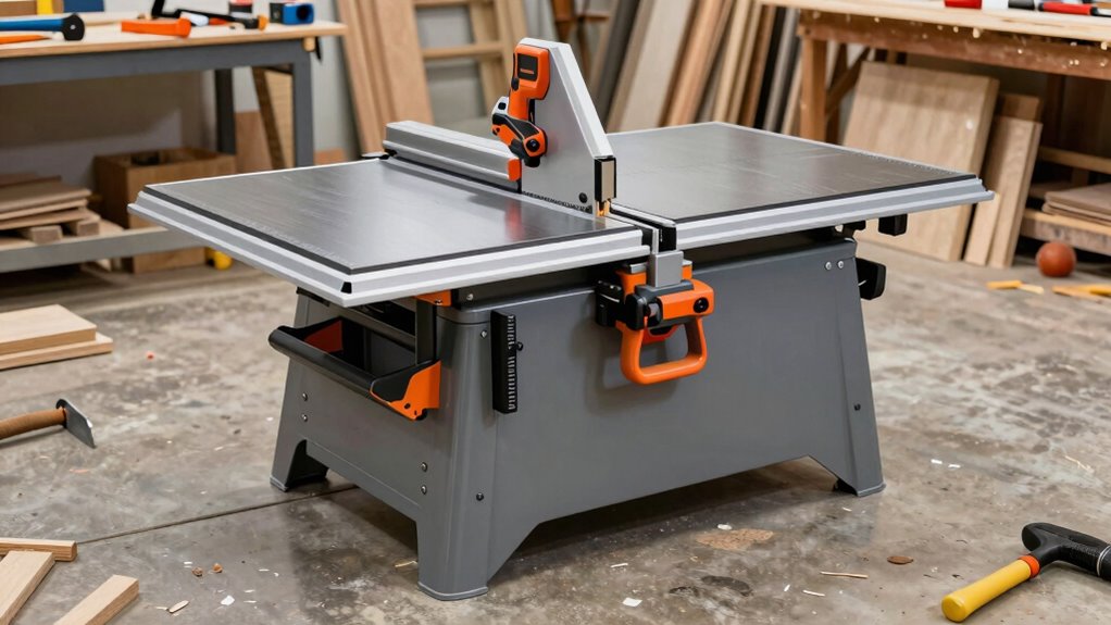 Choosing a jobsite table saw with stand means prioritizing power and performance to get the job done efficiently. A robust motor, ideally at least 15 amps, guarantees it can handle heavy-duty cuts without bogging down. Adjustable blade angles, from 0° to 45°, give you versatility for bevel cuts on different projects. The maximum rip capacity is vital—look for a saw that can handle sheets like 4×8 plywood for larger cuts. RPM matters too; higher speeds around 5000 RPM deliver cleaner, more precise results. Safety features like blade guards, riving knives, and overload protection are indispensable for safe operation during demanding tasks. Balancing power with safety guarantees you can work confidently and efficiently on any job site.