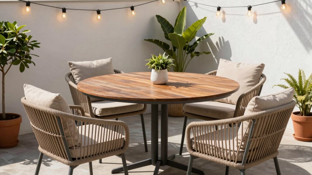 Choosing the right outdoor dining set is like planting a seed—you want it to grow beautifully in your small patio garden. With so many stylish and space-saving options, you’ll find one that fits perfectly and makes every meal feel special. Just remember, the right set isn’t just furniture; it’s the foundation for memories, laughter, and good times under the sun. Pick wisely, and watch your outdoor space flourish.