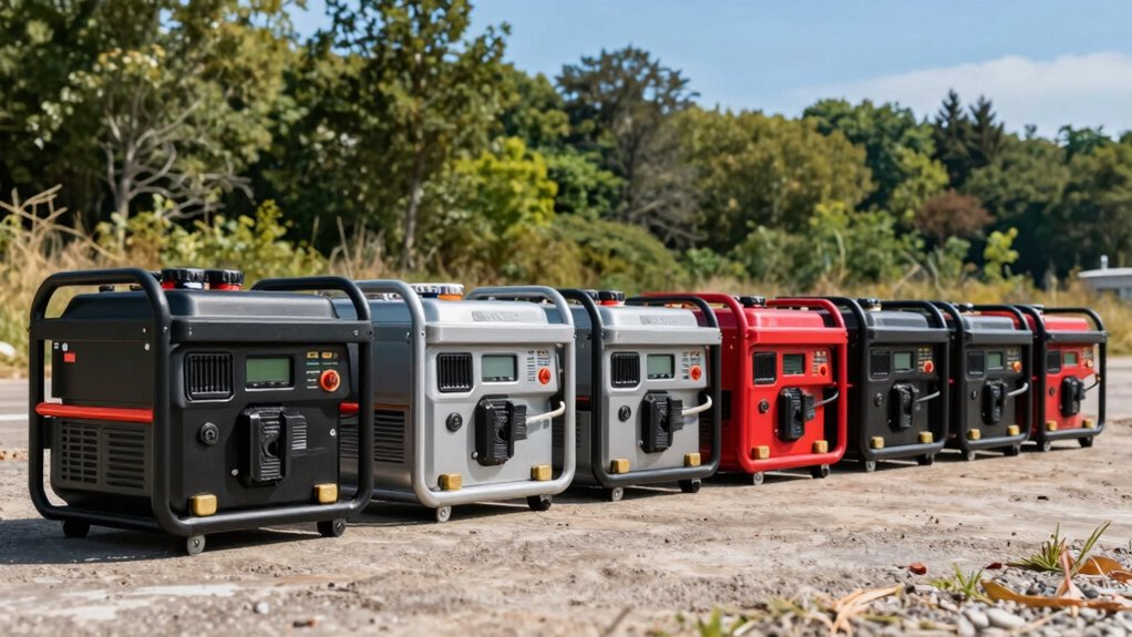 Longer runtime on a single fuel tank means less hassle and more peace of mind during power outages or outdoor adventures. When choosing a generator, fuel efficiency plays a big role in overall convenience and cost. Engine size, load demand, and eco mode settings considerably impact how long your generator runs on a tank. Dual-fuel models offer added flexibility, allowing you to switch fuels for better efficiency or cost savings. Features like fuel shutoff help maximize engine lifespan by burning remaining fuel before shutdown, reducing waste and maintenance. Keep in mind that runtime estimates depend on the load; running at 25% load consumes less fuel and lasts longer than at full capacity. Prioritizing fuel efficiency ensures you get the most out of your generator when it matters most.