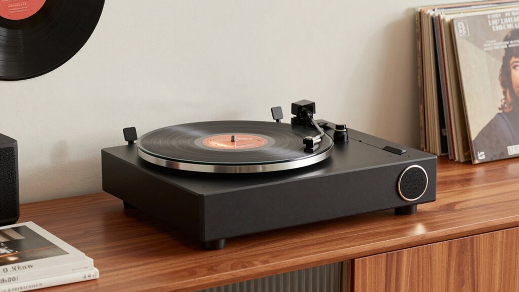 For anyone seeking a versatile and stylish all-in-one record player under $600, the ONE-Q Bluetooth Vinyl Record Player stands out with its built-in speakers and seamless wireless connectivity. It supports 33/45 RPM vinyl and lets you stream wirelessly from smartphones and tablets via Bluetooth 5.4. The four full-range speakers deliver crisp highs and deep bass, while the advanced crossover tech reduces resonance for pure sound. Its user-friendly aluminum panel controls mode, volume, and start. With a sleek design blending retro and modern elements, it’s perfect for beginners or seasoned collectors looking to enjoy high-quality vinyl and wireless streaming in one elegant package.