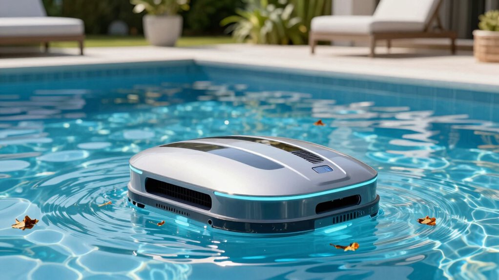 A robot pool skimmer’s ability to thoroughly clean your inground pool depends heavily on its navigation and coverage features. Advanced systems like ultrasonic sensors, dToF sensors, or WavePath technology help the robot map the pool surface, guaranteeing complete coverage. Multi-directional movement, especially around corners and edges, is essential for removing debris from all areas. Obstacle avoidance, using ultrasonic radar or anti-tangle cables, prevents the robot from getting stuck and skips missed spots. Efficient, intelligent algorithms plan cleaning routes that adapt to different pool shapes, slopes, stairs, and waterlines, reducing cleaning time and delivering consistent results. In short, good navigation and coverage are indispensable to guarantee your pool is spotless, no matter its shape or surface complexity.