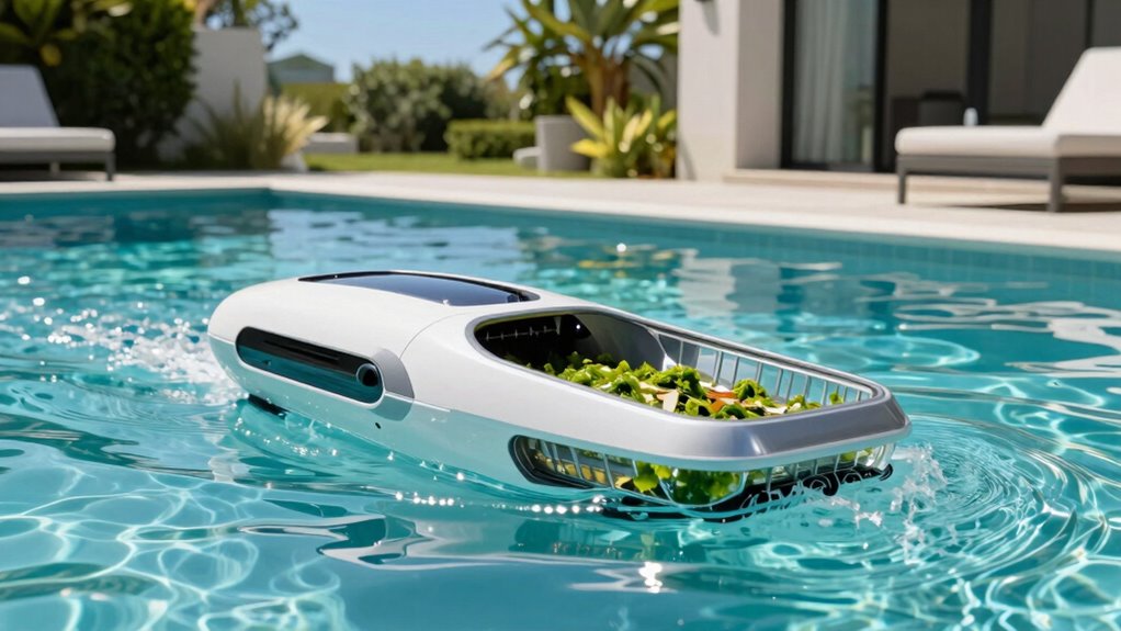 Solar robotic pool skimmers need regular maintenance to stay efficient. I check and clean the solar panels monthly to guarantee they absorb enough sunlight. I also empty the skimmer basket weekly to prevent clogs and debris buildup. Additionally, I inspect the brushes and tracks for wear and tear, replacing parts as needed. Keeping the unit clean and functioning well extends its lifespan and keeps my pool crystal clear.