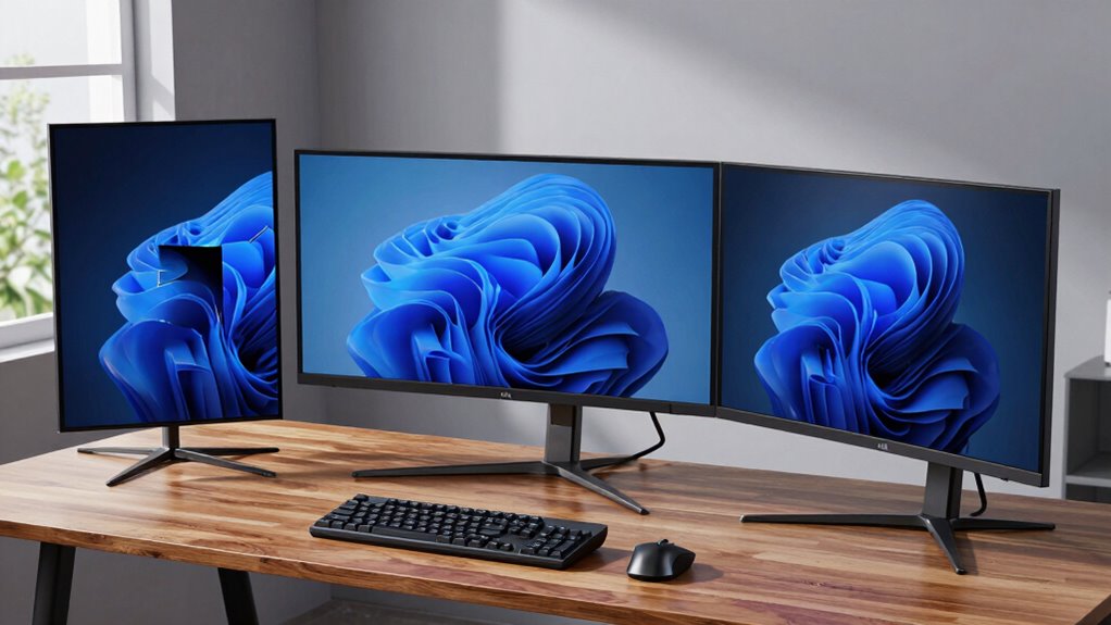 Have you ever wondered how built-in features can elevate your ultrawide monitor experience? Features like HDR support, blue light reduction, and flicker-free technology considerably improve visual quality and reduce eye strain during long sessions. Many monitors also come with integrated speakers, saving space and eliminating the need for external audio devices. PIP (Picture-in-Picture) and PBP (Picture-by-Picture) modes make multitasking effortless by displaying multiple sources simultaneously, boosting productivity. Adjustable stands with tilt, swivel, and height options provide ergonomic comfort tailored to your preferences. Connectivity options such as USB-C, HDMI, and DisplayPort add versatility, allowing seamless device connections and a cleaner workspace. These built-in features not only enhance your viewing experience but also streamline your setup, making your ultrawide monitor a more functional and comfortable tool.