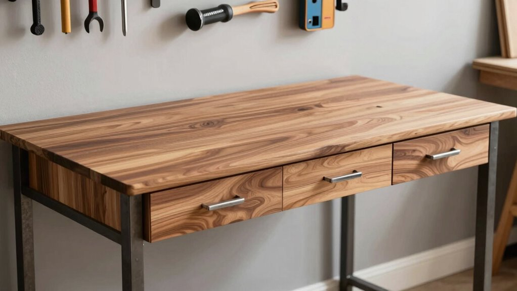 I find that steel and hardwoods are the most durable materials for workbench drawers. Steel offers strength and longevity, resisting dents and warping, making it ideal for heavy tools. Hardwood, like oak or maple, provides a sturdy, wear-resistant surface that can handle frequent use without damage. Combining these materials guarantees your drawers stay functional longer and withstand the rigors of a busy workshop.
